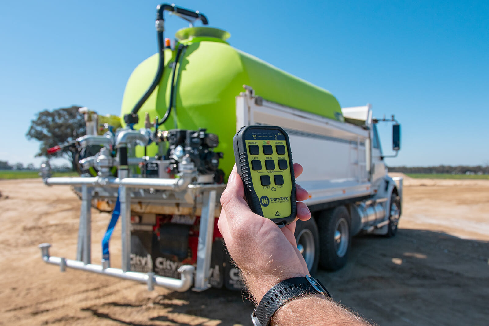 - Handheld Wireless Remote Controlled. Easily switch trucks, Turn motor on/off, spray bar & dribble bar on/off.