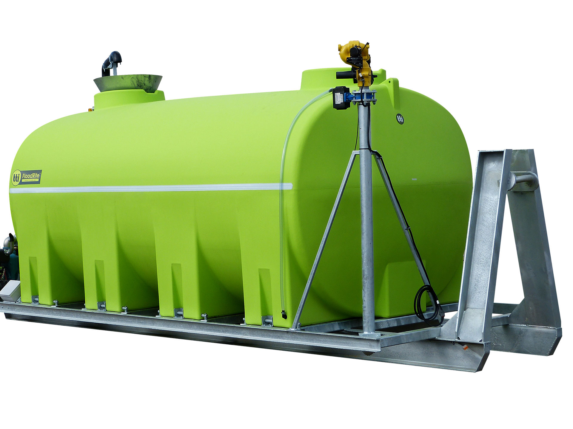The tank is mounted on a heavy duty skid frame, with an a-frame