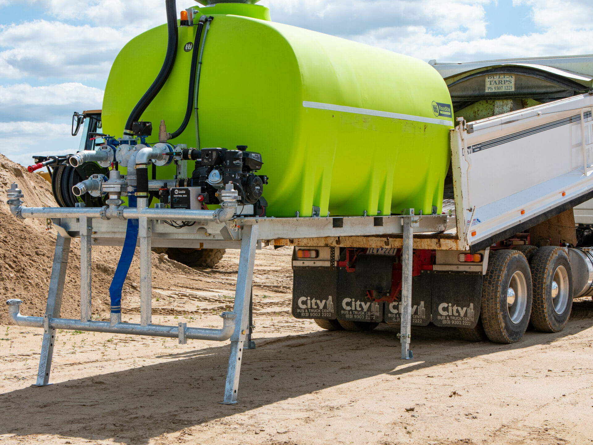 A quality slip-on water cart, like TTi’s FloodRite, incorporates an easy self-loading leg system. Simply reverse with the tipper body slightly raised, the front legs then swing up, and the rollers allow the unit to safely slide in all the way.